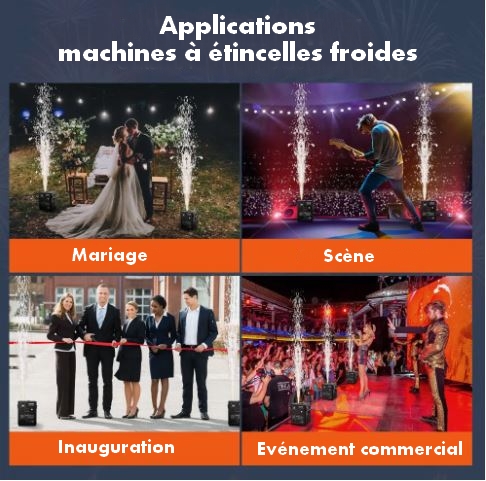La machine à étincelles froides (ou jet de scène) projette des étincelles scintillantes sans combustion, grâce à une technologie spéciale à base de poudre granulaire.